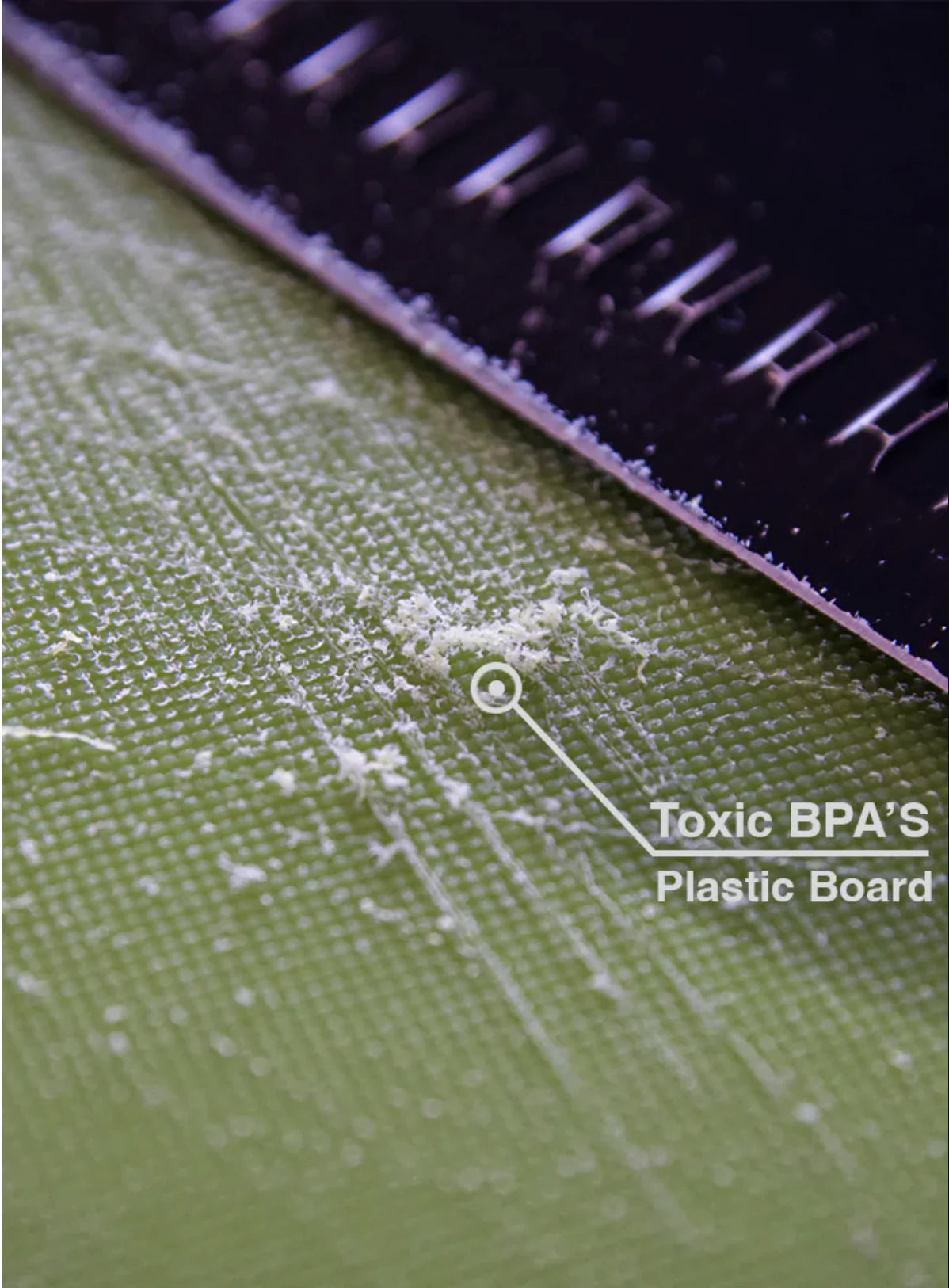 Plastic cutting boards tend to develop deep grooves from knife cuts over time, which can trap bacteria and make them difficult to sanitize completely. Researchers have also shown we eat on average 50g of micro plastics annually that come from plastic cutting boards. These tiny plastic particles not only pollute our bodies but also disrupt hormonal balances & pose long-term health risks. Arguably the worst type of cutting board there is.